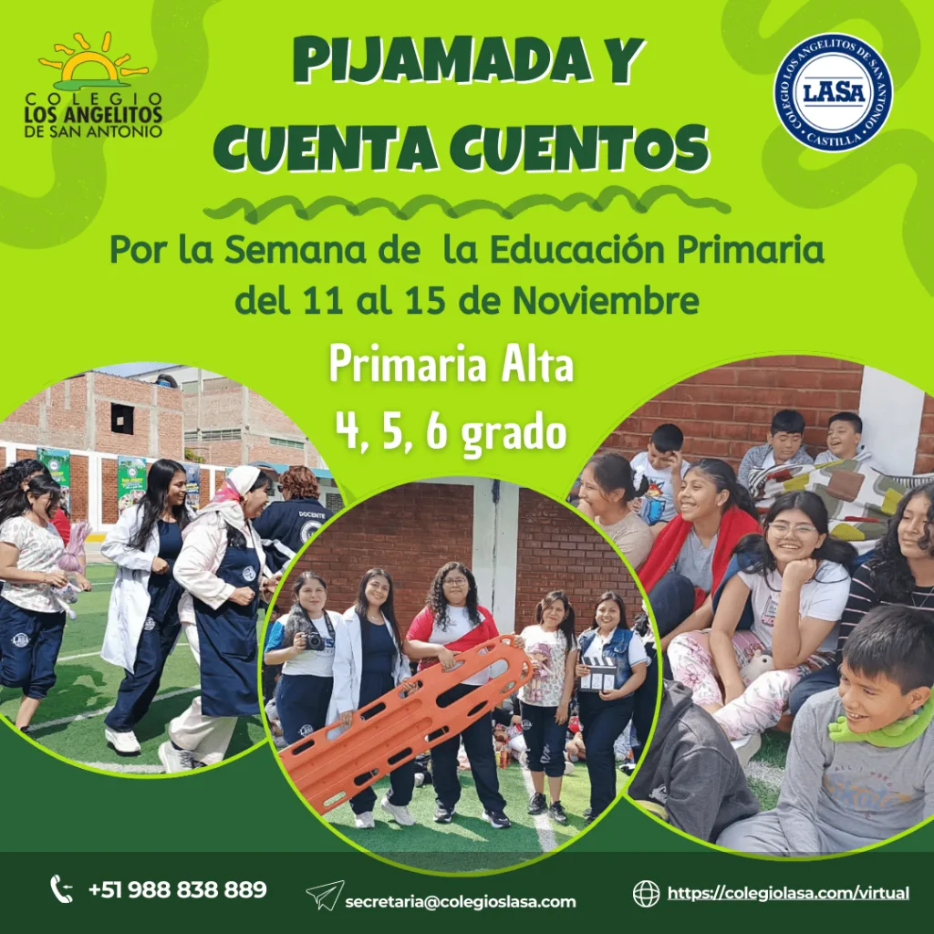 Del 11 al 15 de noviembre, en el Colegio LASA – Los Angelitos de San Antonio, estamos celebrando la Semana de la Educación Primaria con emocionantes actividades como la Pijamada y Cuentacuentos. Estas iniciativas están diseñadas para estudiantes de 1º a 5º grado, divididos en dos grupos: 1º a 3º grado y 4º a 6º grado.